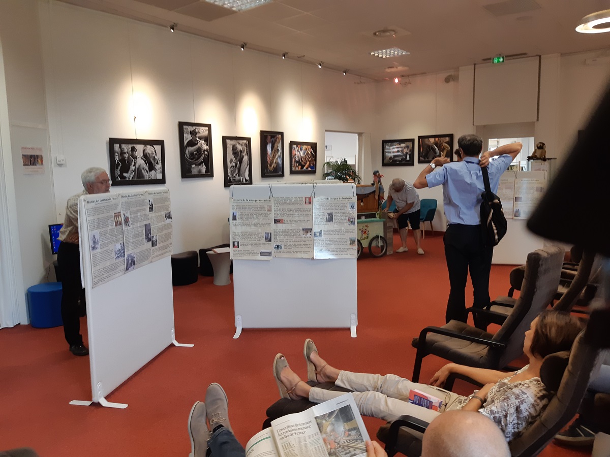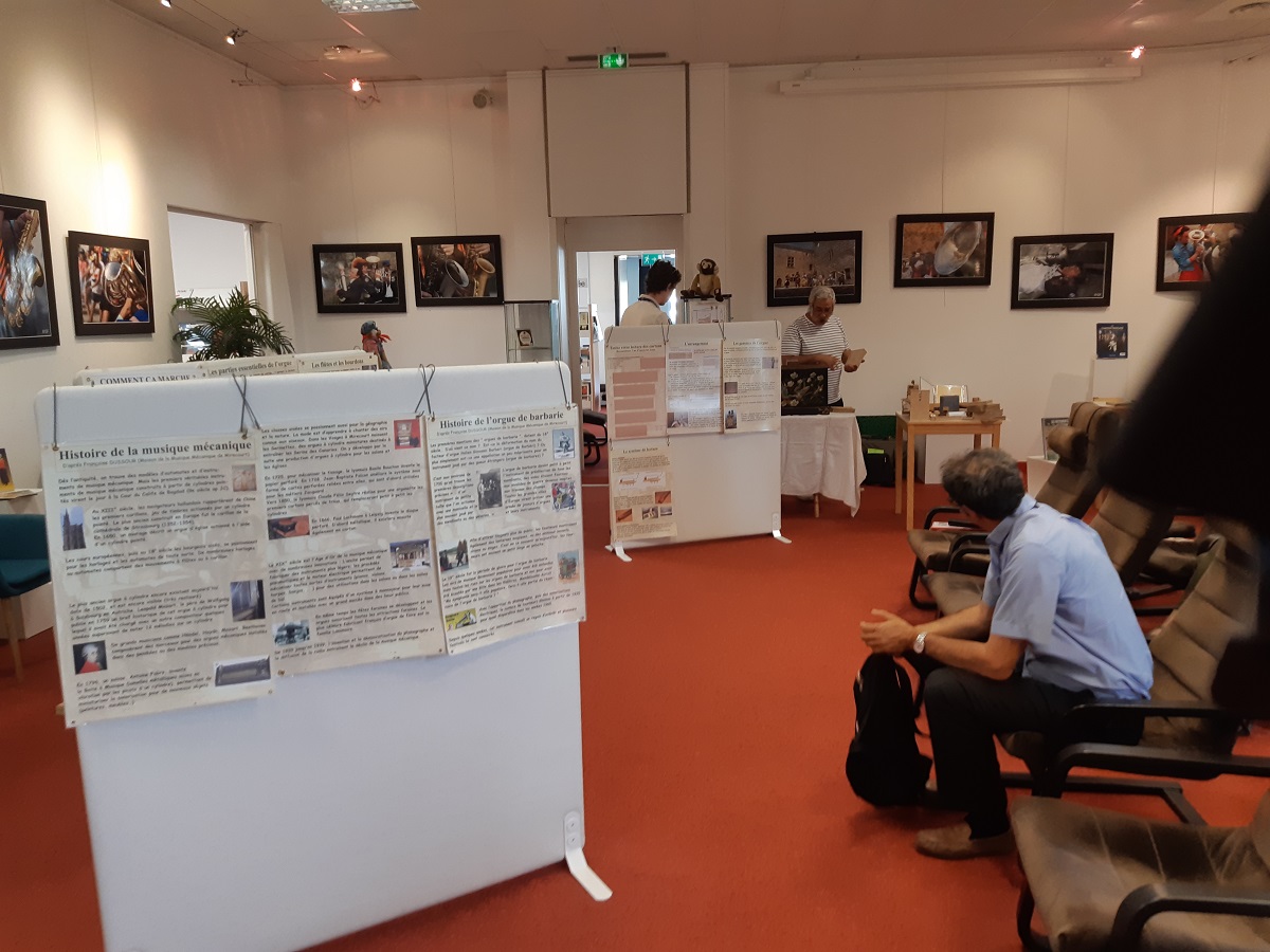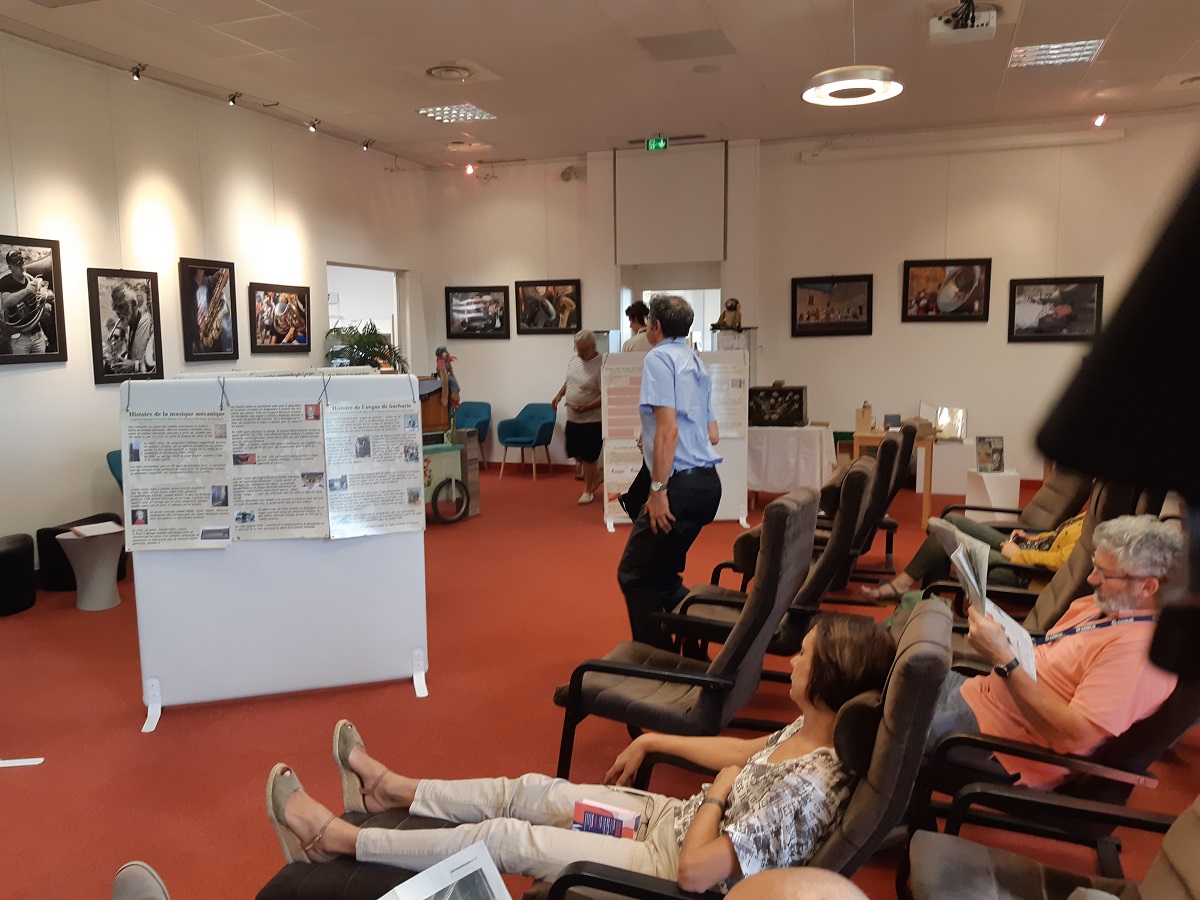 Entre 12h30 et 13h30, nous avons pu présenter l'orgue de barbarie devant un public d'un trentaine de personnes. Certaines étaient venues comme chaque jour pour leur pose lecture. D'autres étaient attirés par la conférence. A l'issue de la conférence, plusieurs personnes sont venues regarder l'orgue de prés et s'essayer à le tourner.