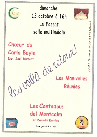 Ce n'est pas l'association Manivelles Occitanes qui s'est engagée dans ce concert, mais elle y a participé par la présence de Claudine et François. Se sont joints à eux Eugène et Martine des Manivelles Cathares et Pierre de Retour de Manivelles. C'est pourquoi, sur l'affiche, nous apparaissons sous le nom des "manivelles réunies", même si dans la presse le nom des manivelles occitanes a pu être mis en évidence.