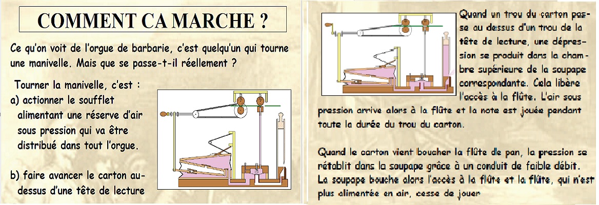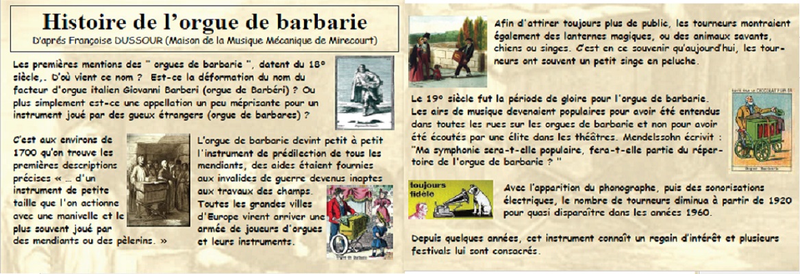 Suite au succès de l'exposition mise au point par Bernard Caudroy, fondateur de l'association Retour de Manivelles, et présentée aux GETS en 2008, nous avons reproduits quelques panneaux sur le fonctionnement de l'orgue et nous les avons complétés sur l'histoire de l'orgue et des chanteurs de rue dans le même esprit, pour présenter lors de nos interventions. Ils se présentent sous la forme qu'une quinzaine de feuilles format A2 plastifiées pouvant facilement s'accorcher sur une grille